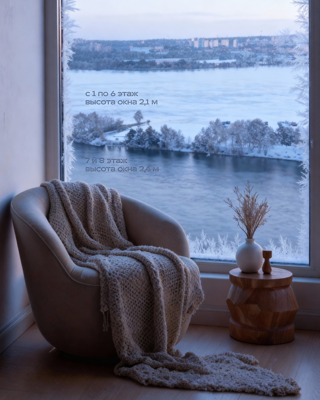 У окон увеличенная высота. С первого по шестой этажи она составляет 2,1 м, а на верхних седьмом и восьмом — 2,4 м. С такими окнами обзор будет роскошным.